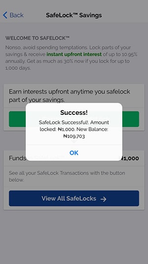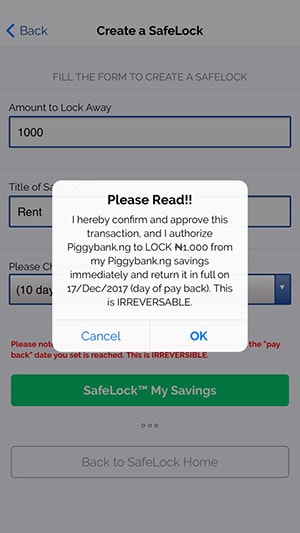 The SafeLock™ feature is one step further in curbing the temptation to touch money that you have put aside as your savings. You can choose to lock all or parts of your PiggyVest savings for any duration between 10 and 1000 days.